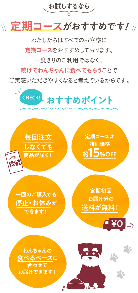 - ※2回目以降の定期コースの袋数、お届け間隔はわんちゃんの食べるペースに合わせて変更可能です。お気軽にご連絡ください。
