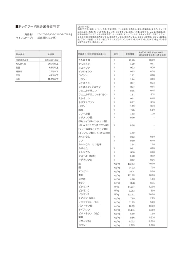 「シニアのためのこのこのごはん」には香料、着色料、保存料、防カビ剤、増粘剤、発色剤、酸化防止剤(BHA.BHT)を使用していません。 (天然の食材だけでは、1日に必要な量を補うことが難しいためビタミンとミネラルのみ合成のものを使用しています。)